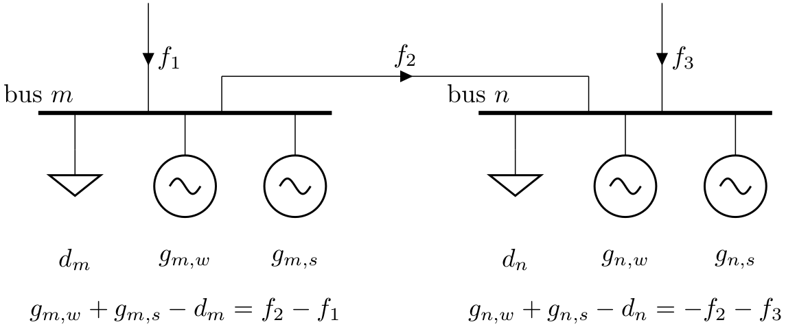 n = pypsa.Network()The second component we need are buses. Buses are the fundamental nodes of the network, to which all other components like loads, generators and transmission lines attach. They enforce energy conservation for all elements feeding in and out of it (i.e. Kirchhoff’s Current Law).